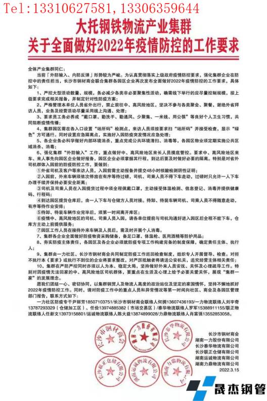 繼3月14日長沙新增1例外省輸入新冠病毒核酸檢測初篩陽性后,相關(guān)部門已立即采取應(yīng)急處置措施。據(jù)小編了解,為認(rèn)真貫徹上級政府疫情防控要求,本地鋼鐵生產(chǎn)企業(yè)加強(qiáng)防控,層層核實(shí)人員情況,目前生產(chǎn)供應(yīng)情況一切正常。厚壁無縫鋼管市場交易活動有序進(jìn)行,暫無工地受此影響停工。為防患于未然,長沙市厚壁無縫鋼管商會聯(lián)合集群各園區(qū)企業(yè)再次發(fā)布全面做好2022年疫情防控的工作要求,具體情況如下: