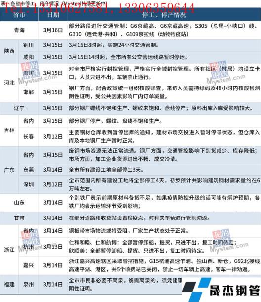 截至3月16日,匯總了10個(gè)省份最新停工停產(chǎn)信息。其中,河北省于3月15日宣布,除張家口、承德、秦皇島市按有關(guān)規(guī)定供暖時(shí)間外,其他法定3月15日停暖的地方供暖時(shí)間統(tǒng)一延長至3月31日24時(shí)。陜西省銅川市于15日宣布全市范圍內(nèi)實(shí)施24小時(shí)交通管制;咸陽市15日宣布全市所有公交營運(yùn)路線暫時(shí)停運(yùn)。吉林省部分無縫厚壁鋼管廠家停產(chǎn),螺紋、盤線不飽和生產(chǎn)。與此同時(shí),全國其他地區(qū)鋼貿(mào)交易也受到影響,部分工地開始停工,物流運(yùn)輸暫停服務(wù)。具體情況如下: