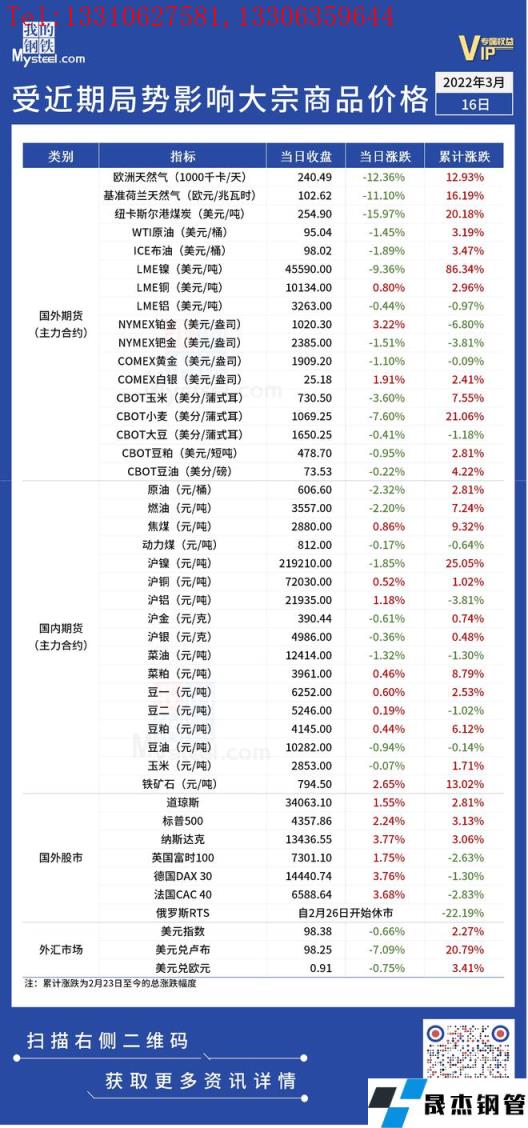 近期,受?chē)?guó)際局勢(shì)影響,全球金融及大宗商品市場(chǎng)出現(xiàn)較大波動(dòng)。據(jù)央視新聞報(bào)道,俄烏雙方準(zhǔn)備好了一份在烏克蘭保持中立、裁軍的前提下實(shí)施的停火撤軍計(jì)劃,國(guó)際能源價(jià)格繼續(xù)大跌。倫敦金屬交易所則宣布,將不會(huì)發(fā)布周三收盤(pán)價(jià),因?yàn)殒噧r(jià)在收盤(pán)價(jià)確定期間處于跌停狀態(tài)。跌停價(jià)45590美元/噸將繼續(xù)用于LME清算所的保證金計(jì)算,以及周四漲跌停的基礎(chǔ)。另外,美聯(lián)儲(chǔ)加息如期而至,美國(guó)三大股指跌宕起伏走出V型反彈。匯總情況如下: