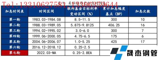 從歷史上來看(表1),美聯(lián)儲(chǔ)一共進(jìn)行了6輪加息周期,雖然美聯(lián)儲(chǔ)基于同樣的出發(fā)點(diǎn)為了控制通脹風(fēng)險(xiǎn),維持經(jīng)濟(jì)穩(wěn)步發(fā)展進(jìn)行調(diào)控,但其中造成每次加息的因素多種多樣,最早的時(shí)間可以追溯到1983年期間,美國在經(jīng)濟(jì)復(fù)蘇的初期中通脹率達(dá)到了驚人的13.5%后美聯(lián)儲(chǔ)急需控制通脹率;也不乏在1999與2004年中為了對(duì)抗互聯(lián)網(wǎng)泡沫以及房地產(chǎn)泡沫;在2016年第六輪加息中為了平衡前期充分的量化寬松。北京時(shí)間3月17日零點(diǎn)美聯(lián)儲(chǔ)第七輪加息正式落地,其中根據(jù)圖1美聯(lián)儲(chǔ)FOMC點(diǎn)陣圖做出的預(yù)判,本年度2022年加息次數(shù)將預(yù)計(jì)達(dá)到7次,并且在2023年底利率將達(dá)到2.8%。