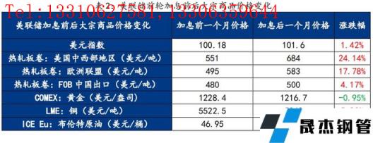 那么,在美聯(lián)儲(chǔ)歷史上進(jìn)行加息的時(shí)間區(qū)間中,大宗商品價(jià)格都是如何變化的呢?選取了美聯(lián)儲(chǔ)第六輪加息期間(2016.12-2018.12)美元指數(shù)、熱軋板卷、黃金、銅、布倫特原油作為參考標(biāo)的進(jìn)行分析,其中參考時(shí)間維度為2016年加息落地前一個(gè)月的交易日價(jià)格與加息落地后一個(gè)月的交易日價(jià)格(表2)。