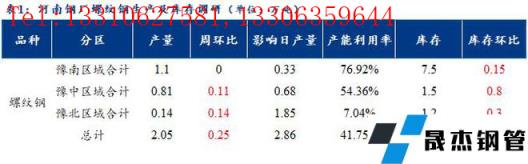 調(diào)研數(shù)據(jù)顯示,統(tǒng)計(jì)的河南地區(qū)10家建筑厚壁無縫鋼管樣本無縫厚壁鋼管廠家中,本周2家無縫厚壁鋼管廠家處于正常生產(chǎn),4家無縫厚壁鋼管廠家處于部分軋線停產(chǎn)檢修或不飽和生產(chǎn),其余4家處于停產(chǎn)生產(chǎn)狀態(tài)。從產(chǎn)量數(shù)據(jù)來看,目前河南地區(qū)10家樣本無縫厚壁鋼管廠家建筑厚壁無縫鋼管總?cè)站a(chǎn)量為2.66萬噸,較上周增加0.13萬噸。其中螺紋日產(chǎn)量為2.05萬噸,線盤日產(chǎn)量為0.61萬噸。從區(qū)域來看,豫南地區(qū)無縫厚壁鋼管廠家建筑厚壁無縫鋼管總?cè)债a(chǎn)量1.49萬噸,豫中地區(qū)無縫厚壁鋼管廠家建筑厚壁無縫鋼管總?cè)债a(chǎn)量1.03萬噸,豫北地區(qū)無縫厚壁鋼管廠家建筑厚壁無縫鋼管總?cè)债a(chǎn)量0.14萬噸。本周河南區(qū)域無縫厚壁鋼管廠家檢修/限產(chǎn)影響建材日產(chǎn)量為3.38萬噸,產(chǎn)能利用率為44.4%,本周產(chǎn)量繼續(xù)處于回升狀態(tài)。