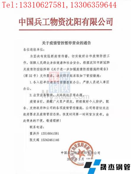 目前沈陽厚壁無縫鋼管中心批發(fā)市場已發(fā)布通告,19日起北一西路東西樓試試封閉管控、嚴(yán)禁人員進(jìn)入辦公,出庫業(yè)務(wù)暫停、火車到達(dá)正常辦理;中國兵工物資125庫通告19日起嚴(yán)禁人員進(jìn)入庫區(qū)辦公,出庫業(yè)務(wù)暫停、火車到達(dá)正常辦理;國家糧食和物資儲備局遼寧局二三九處通告19日起辦公樓嚴(yán)禁進(jìn)出,庫內(nèi)所有出入庫業(yè)務(wù)暫停、火運到達(dá)正常辦理。市內(nèi)其他主要厚壁無縫鋼管市場反饋暫時正常辦公及出庫,但從防控指揮部通告內(nèi)容來看、也有暫停營業(yè)的傾向。(通告見文末圖片)