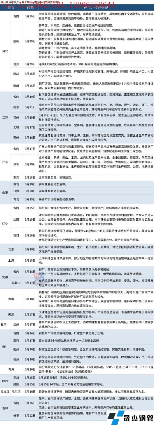 截至3月21日,匯總了16個(gè)省份停工停產(chǎn)最新信息。其中,3月21日,南京全市范圍內(nèi)除保障市民生活和城市基本運(yùn)行的水、電、燃油、燃?xì)?、通訊、環(huán)衛(wèi)、糧油肉菜供應(yīng)等公共服務(wù)類(lèi)企事業(yè)單位外,其他有條件的單位盡可能安排居家辦公。3 月20日,唐山開(kāi)平區(qū)、豐南區(qū)、灤州市、遷西縣全域?qū)嵤﹪?yán)格封控管理;大部分鋼企維持生產(chǎn),但政府實(shí)施道路管控,無(wú)縫厚壁鋼管廠家均面臨運(yùn)輸方面的問(wèn)題。深圳全市福田、羅湖、南山、寶安、龍崗以及龍華暫未恢復(fù),全市封控區(qū)、管控區(qū)、防范區(qū)繼續(xù)嚴(yán)格執(zhí)行疫情防控相關(guān)措施。山東濰坊日照、青島萊西市實(shí)現(xiàn)社會(huì)面動(dòng)態(tài)清零。河北滄州連續(xù)4天實(shí)現(xiàn)社會(huì)面動(dòng)態(tài)清零,3月20日起部分地區(qū)逐步解除封控。具體情況如下: