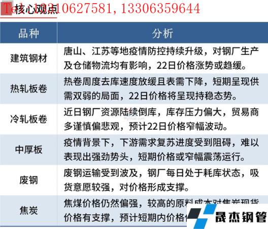國內多省市升級調整疫情防控,下游工地施工進度放緩,導致鋼市成交量下滑。無縫厚壁鋼管廠家生產影響相對較小,但若唐山交通管制持續(xù),不排除高爐廠也會減產或停產。短期內,鋼市供需基本面偏弱,成本支撐力度較強。在重大利好政策出臺以及全國疫情得到有效控制之前,鋼價或繼續(xù)震蕩運行。