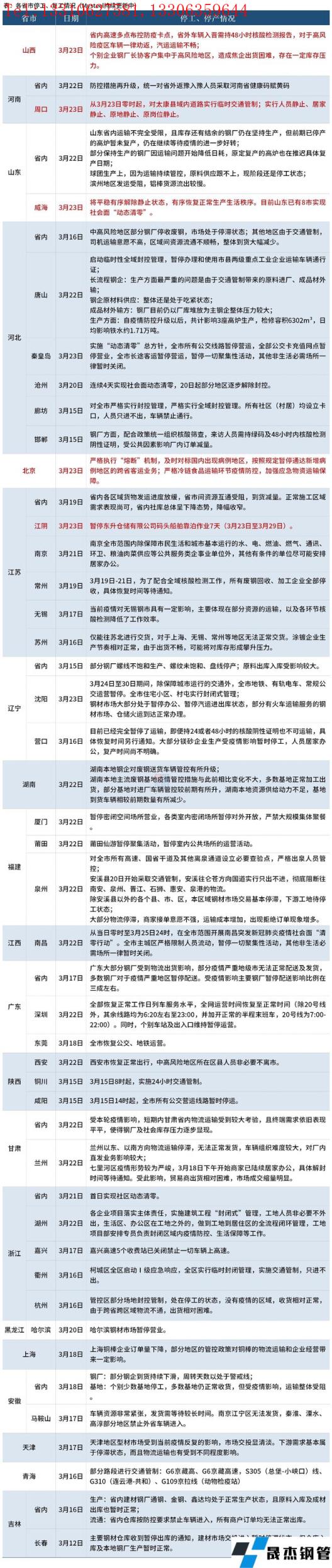 截至3月24日,匯總了20個(gè)省份停工復(fù)工最新信息。其中,3月23日,山西省內(nèi)高速多點(diǎn)布控防疫卡點(diǎn),省外車輛入晉需持48小時(shí)核酸檢測(cè)報(bào)告,對(duì)于高風(fēng)險(xiǎn)疫區(qū)車輛一律勸返,汽運(yùn)運(yùn)輸不暢;個(gè)別企業(yè)無縫厚壁鋼管廠家長(zhǎng)協(xié)客戶集中于高風(fēng)險(xiǎn)地區(qū),造成焦企出貨困難,存在一定庫存壓力。河南周口從3月23日零時(shí)起,對(duì)太康縣域內(nèi)道路實(shí)行臨時(shí)交通管制;實(shí)行人員靜止、居家靜止、原地靜止、原崗位靜止。山東威海于3月23日將平穩(wěn)有序解除靜止?fàn)顟B(tài),有序恢復(fù)正常生產(chǎn)生活秩序,目前山東已有8市實(shí)現(xiàn)社會(huì)面“動(dòng)態(tài)清零”。具體情況如下: