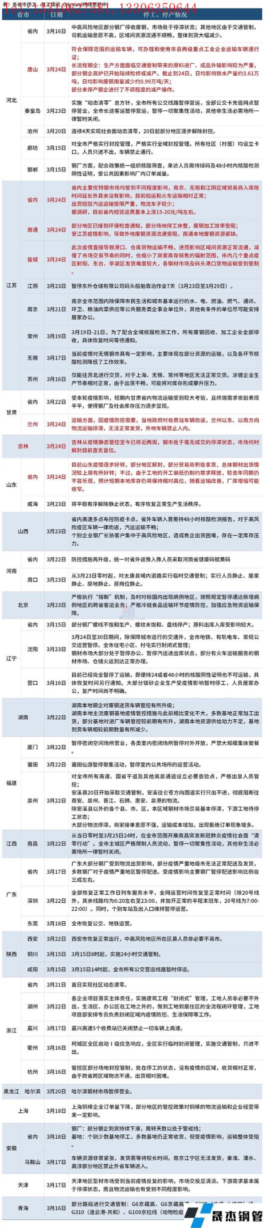 截至3月25日,匯總了20個(gè)省份停工復(fù)工最新信息。其中,河北唐山市符合保障范圍的運(yùn)輸車(chē)輛,可辦理和使用市縣兩級(jí)重點(diǎn)工業(yè)企業(yè)運(yùn)輸車(chē)輛通行證。江蘇南通部分地區(qū)已接到環(huán)保檢查通知,部分場(chǎng)地停工休整,廢鋼加工效率受阻。吉林從疫情靜態(tài)管控至3月24日將近兩周,鋼市處于毫無(wú)成交的停滯狀態(tài),市場(chǎng)何時(shí)解封目前杳無(wú)音信。具體情況如下: