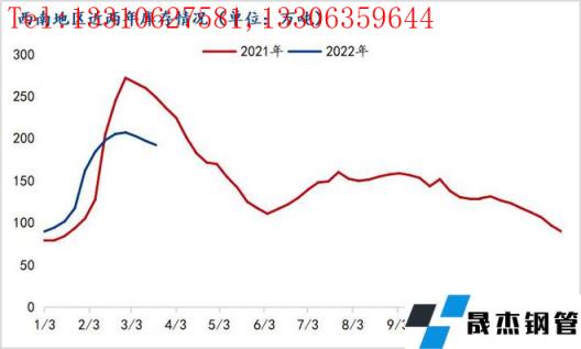 三月份西南地區(qū)建筑厚壁無縫鋼管窄幅震蕩運(yùn)行,下游復(fù)工復(fù)產(chǎn)不及預(yù)期、全國疫情再次擴(kuò)散、俄烏局勢沖突未息等多重因素疊加,放緩了季節(jié)性需求釋放的速度,西南整體去庫存速度同比偏緩慢。筆者就西南地區(qū)庫存數(shù)據(jù)情況作簡要分析。