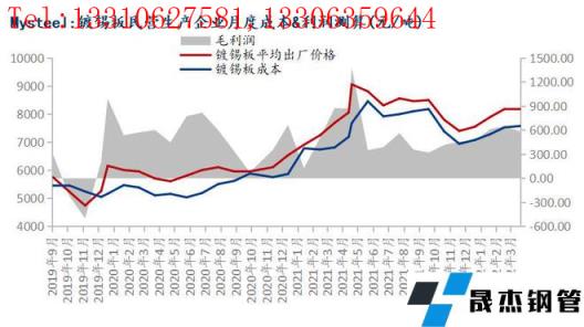 對民營企業(yè)成本&利潤測算數(shù)據(jù)顯示:2022年4月份鍍錫板生產(chǎn)成本7576.51元/噸,月環(huán)比增加48.2元/噸;毛利583.49元/噸,月環(huán)比下降68.2元/噸,同比下滑284.27元/噸,全流程企業(yè)整體利潤尚可。4月基板結(jié)算成本增加、疫情影響下,運輸成本上漲明顯,錫錠成本窄幅回調(diào),鍍錫板出廠價格挺價意愿偏弱。
