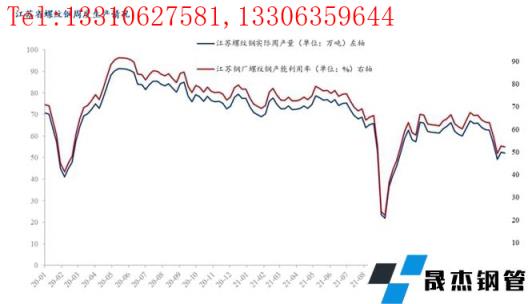 圖二:江蘇省螺紋鋼產(chǎn)量及開工走勢圖
