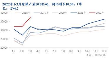 2022年1-3月全國原煤產(chǎn)量累計生產(chǎn)10.8億噸,同比增長10.3%,其中3月份原煤產(chǎn)量3.96億噸,同比增長14.8%。國家能源局3月發(fā)布《2022年能源工作指導(dǎo)意見》,提出將著力增強(qiáng)國內(nèi)能源生產(chǎn)保障能力,切實把能源飯碗牢牢地端在自己手里。