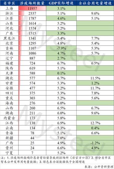 表1.截至5月7日全國省份涉疫場所數(shù)量與一季度GDP、用電量增速排名