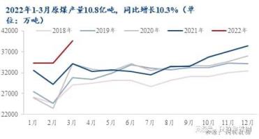 2022年1-3月全國(guó)原煤產(chǎn)量累計(jì)生產(chǎn)10.8億噸,同比增長(zhǎng)10.3%,其中3月份原煤產(chǎn)量3.96億噸,同比增長(zhǎng)14.8%。國(guó)家能源局3月發(fā)布《2022年能源工作指導(dǎo)意見》,提出將著力增強(qiáng)國(guó)內(nèi)能源生產(chǎn)保障能力,切實(shí)把能源飯碗牢牢地端在自己手里。