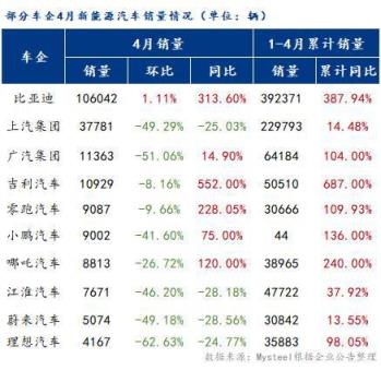 據(jù)統(tǒng)計(jì),截至5月11日,4月銷量與上年同期相比,比亞迪銷量增速依然最為明顯。具體來看,比亞迪銷量106042輛穩(wěn)居第一,環(huán)比增長(zhǎng)1.11%,同比增長(zhǎng)313.6%;其次是上汽集團(tuán)銷量37781輛,環(huán)比下降49.29%,同比下降25.03%,值得一提的是吉利汽車銷量增幅最大,高達(dá)552%。受疫情影響,4月份絕大部分新能源車企銷量全線大跌,上汽、廣汽、小鵬等自主品牌車企無一例外集體銷量下滑,跌幅超過兩位,而比亞迪卻一直占據(jù)領(lǐng)先地位,銷量不僅沒跌,還一直保持穩(wěn)增長(zhǎng)。