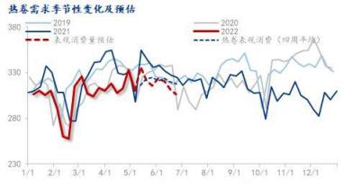 4月下旬開(kāi)始海外熱卷的緊張程度有所緩解,一方面,西歐對(duì)于高價(jià)格的承受能力有限,導(dǎo)致了市場(chǎng)的投機(jī)情緒有所下降;另一方面,俄烏資源也恢復(fù)了一部分出口,使得緊張的情況有所緩解。目前歐洲對(duì)于我國(guó)的懲罰性關(guān)稅和反補(bǔ)貼稅依然較高,當(dāng)?shù)卦谫?gòu)買(mǎi)時(shí)首選依然不是我國(guó),所以對(duì)于剛需而言,西歐并不在我國(guó)鋼鐵出口的范圍內(nèi)。從6-7月船期的情況看,環(huán)比下降的情況概率較大,預(yù)計(jì)在-15%~-20%的水平。下降完以后,國(guó)內(nèi)外比價(jià)依然存在,所以大致可以判斷,出口量會(huì)有所維持,但高點(diǎn)已現(xiàn),預(yù)期每個(gè)月量在100-120萬(wàn)噸水平。