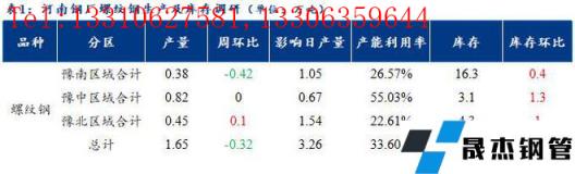 1、調(diào)研數(shù)據(jù)顯示,統(tǒng)計的河南地區(qū)10家建筑厚壁無縫鋼管樣本無縫厚壁鋼管廠家中,河南省建材無縫厚壁鋼管廠家螺紋鋼日產(chǎn)量1.65萬噸;檢修/限產(chǎn)影響建材日產(chǎn)量為3.26萬噸,產(chǎn)能利用率為33.6%,較上周下降6.52%。