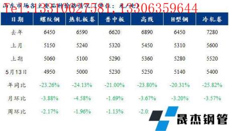 本周山東鋼市各品種價(jià)格整體呈大幅下跌的走勢(shì),本周在期貨震蕩偏弱運(yùn)行,由于下游需求較差,現(xiàn)貨市場(chǎng)成交受阻,現(xiàn)貨價(jià)格大幅下跌運(yùn)行。周初,市場(chǎng)在期貨上行、原料價(jià)格大漲帶動(dòng)下成材價(jià)格整體拉漲,之后期貨大幅下行,現(xiàn)貨價(jià)格整體大幅下行。從各品種的價(jià)格表現(xiàn)來(lái)看,本周所有品種價(jià)格基本弱勢(shì)運(yùn)行,其中H型鋼跌幅最大,下跌140元/噸,跌幅2.65%,中板跌幅最少,為60元/噸,跌幅為1.13%。(表1所示)具體情況如下: