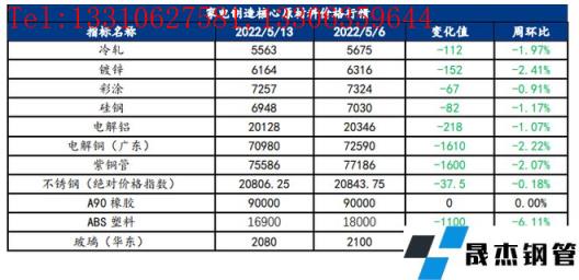 截止2022年5月13日,各原材料當日即時價格以及價格周環(huán)比情況如下:
