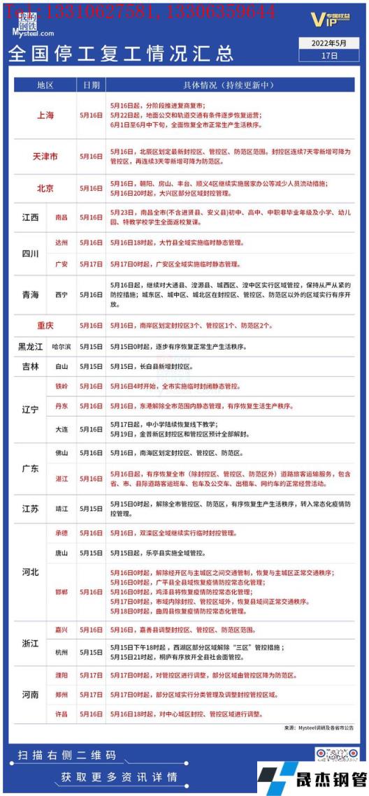 截至5月17日,據(jù)不完全統(tǒng)計,共有15個省份發(fā)布了停工復工最新信息。5月16日起,上海分階段推進復商復市。天津多地劃分為封控管控區(qū)。湛江有序恢復道路旅客運輸服務(wù)。四川廣安市廣安區(qū)、達州市大竹縣全域?qū)嵤┡R時靜態(tài)管理。具體情況如下:
