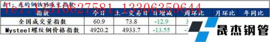 訊:全國建筑厚壁無縫鋼管成交量監(jiān)測,成交量相對指數(shù)來看,全國60.9減12.9,北方51.1減0.5,華東75.7減22.9,南方51.5減9.8。今日螺紋鋼價(jià)格指數(shù)4920.2,較上一交易日減13.55。