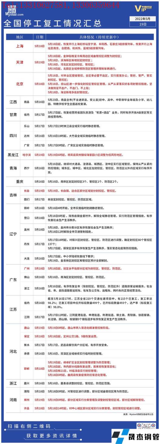 截至5月19日,據(jù)不完全統(tǒng)計(jì),共有16個(gè)省份發(fā)布了停工復(fù)工最新信息。北京多地強(qiáng)化封控區(qū)管控區(qū)管理。天津多地調(diào)整為封控區(qū)。上海再恢復(fù)開行8趟列車。唐山轉(zhuǎn)入常態(tài)化精準(zhǔn)管控新階段。具體情況如下:
