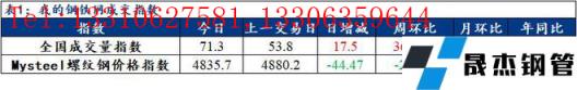 訊:全國建筑厚壁無縫鋼管成交量監(jiān)測(cè),成交量相對(duì)指數(shù)來看,全國71.3增17.5,北方53.1增12.4,華東93.3增21.9,南方59.3增15.9。今日螺紋鋼價(jià)格指數(shù)4835.7,較上一交易日減44.47。