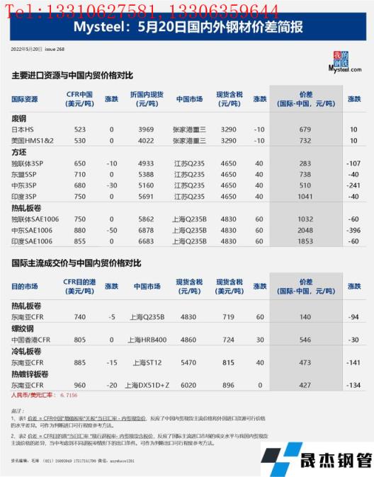 免責聲明:本網(wǎng)站(山東聊城晟杰無縫鋼管廠www.abagaf.com)刊載的“2022年05月20日日報:國內(nèi)外鋼材_無縫鋼管價差匯總(2022.5.20)”等均源于網(wǎng)絡(luò),版權(quán)歸原作者所有,且僅代表原作者觀點,本文所載信息僅供參考。轉(zhuǎn)載僅為學習與交流之目的,如無意中侵犯您的合法權(quán)益,請及時聯(lián)系刪除。本網(wǎng)站刊登此篇文章并不意味著本站贊同其觀點或證實其內(nèi)容的真實性,我們不對其科學性、嚴肅性等作任何形式的保證。如果侵犯了您的版權(quán),請盡快聯(lián)系我們予以撤銷,謝謝合作!
