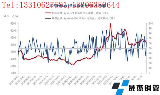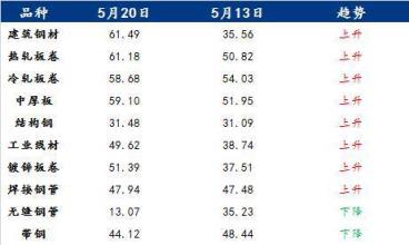 具體各品種指數(shù)來看,5月20日建筑厚壁無縫鋼管情緒指數(shù)為61.49,較5月13日回升25.93;熱軋板卷情緒指數(shù)為61.18,較5月13日回升10.36;冷軋板卷情緒指數(shù)為58.68,較5月13日回升4.65;中厚板情緒指數(shù)為59.1,較5月13日回升7.15;結(jié)構(gòu)鋼情緒指數(shù)為31.48,較5月13日回升0.39;工業(yè)線材情緒指數(shù)為49.62,較5月13日回升10.88;鍍鋅板卷情緒指數(shù)為51.39,較5月13日回升13.88;焊接厚壁鋼管情緒指數(shù)為47.94,較5月13日回升0.46;無縫厚壁鋼管情緒指數(shù)為13.07,較5月13日回落22.16;帶鋼情緒指數(shù)為44.12,較5月13日回落4.32。