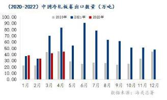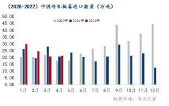 海關(guān)總署數(shù)據(jù)顯示:2022年1-4月份我國(guó)冷軋板(帶)出口總量共計(jì)159.53萬(wàn)噸,年同比下降40.79%。2022年1-4月份我國(guó)冷軋板(帶)進(jìn)口總量共計(jì)96.25萬(wàn)噸,年同比上升1.90%。
