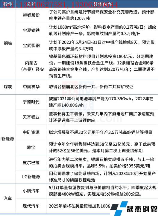 5月24日,匯總部分大宗商品相關(guān)企業(yè)動(dòng)態(tài)。寧夏鋼鐵、寶武鄂鋼宣布檢修計(jì)劃,柳鋼股份計(jì)劃進(jìn)行高爐改造;天齊鋰業(yè)董事長(zhǎng)蔣衛(wèi)平表示,鋰電行業(yè)景氣度高,未來(lái)幾年內(nèi)下游電池廠商擴(kuò)張速度預(yù)計(jì)還是遠(yuǎn)高于上游鋰供應(yīng)。具體情況如下: