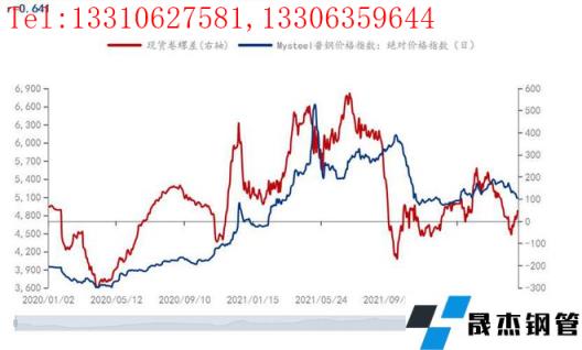從上述五個階段,盤面卷螺差在鋼價上行中更容易走高,在鋼價下跌中更容易走低(第一階段、第二階段),但也會出現(xiàn)一定的分化。在第三階段,為貫徹實施碳達峰、碳中和,無縫厚壁鋼管廠家供應(yīng)減少、供需錯配,此時建筑厚壁無縫鋼管供應(yīng)大幅收縮,雖然鋼價暴漲,但盤面卷螺差高位震蕩。經(jīng)濟周期上行時,制造業(yè)需求向好,卷板漲勢更好;反之在經(jīng)濟下行周期,制造業(yè)需求萎縮,卷板更多是跟隨建筑厚壁無縫鋼管趨勢波動。第四階段、第五階段,鋼價暴跌后筑底反彈,盤面卷螺差則繼續(xù)震蕩走勢,但高點降低,反映了在經(jīng)濟下行周期,制造業(yè)表現(xiàn)低迷,為穩(wěn)增長建筑業(yè)表現(xiàn)會相對好些。
