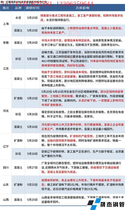 截至5月27日,據(jù)百年建筑網(wǎng)調(diào)研,8個省份建材市場受到了不同程度的影響。進(jìn)入五月下旬后,施工整體進(jìn)度尚未進(jìn)入“減速”階段,今年整體施工進(jìn)度提升緩慢,市場需求降幅拐點未來臨。目前疫情防控形勢繼續(xù)好轉(zhuǎn),建筑材料發(fā)運量有一定上升空間?,F(xiàn)華東地區(qū)疫情雖得到了一定的控制,但由于交通管控因素,材料運輸仍存在一定壓力。具體情況如下: