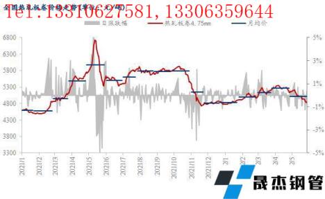 截至5月30日,國內24個主要城市4.75mm熱軋板卷均價為4873元/噸,月環(huán)比下跌267元/噸,較去年同期下跌696元/噸。