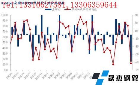 從相關指數(shù)來看,本月成品材出廠價指數(shù)大幅回落60.4個百分點至8.3,刷新年內低點,無縫厚壁鋼管廠家成品材庫存指數(shù)回落9.5個百分點至63.4,仍處榮枯線上方。同時成材價格下跌倒逼原料價格,本月原材料采購價指數(shù)大幅回落68.5個百分點至12.1,國內原材料采購量指數(shù)回落6.6個百分點至45.3,國外原材料采購量指數(shù)回落5.6個百分點至38.5。
