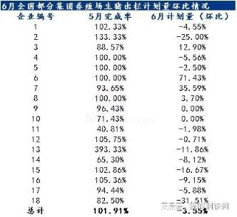 據(jù)農(nóng)產(chǎn)品調(diào)研了解,針對(duì)18家集團(tuán)養(yǎng)殖場全國生豬出欄情況來看,5月生豬出欄完成率總計(jì)101.91%,6月出欄量較5月實(shí)際出欄量環(huán)比下跌3.55%。