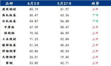 具體各品種指數(shù)來看,6月3日建筑厚壁無縫鋼管情緒指數(shù)為80.19,較5月27日回升18.22;熱軋板卷情緒指數(shù)為60.47,較5月27日回落2.89;冷軋板卷情緒指數(shù)為54.87,較5月27日回落1.61;中厚板情緒指數(shù)為67.09,較5月27日回升8.62;結(jié)構(gòu)鋼情緒指數(shù)為70.06,較5月27日回升23.47;工業(yè)線材情緒指數(shù)為71.23,較5月27日回升18.39;鍍鋅板卷情緒指數(shù)為51.04,較5月27日回升10.41;焊接厚壁鋼管情緒指數(shù)為65.86,較5月27日回升20.82;無縫厚壁鋼管情緒指數(shù)為26.51,較5月27日回升7.06;帶鋼情緒指數(shù)為53.8,較5月27日回升11.09。