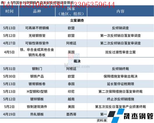 據(jù)不完全統(tǒng)計(jì),2022年4-5月中國(guó)貿(mào)易救濟(jì)信息網(wǎng)陸續(xù)公布了11起國(guó)外對(duì)中國(guó)鋼鐵產(chǎn)品發(fā)起的反傾銷(xiāo)、反補(bǔ)貼調(diào)查或裁決。涉案品種包括可再裝不銹鋼桶、無(wú)縫鋼鐵管、可鍛性鑄鐵管件、鋼制門(mén)、鍍錫鋼板卷、H型鋼和I型鋼、鍍鋅鋼板和熱軋鋼板等。具體如下:
