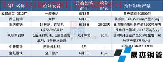 據(jù)不完全統(tǒng)計(jì),截至6月7日,國內(nèi)6家無縫厚壁鋼管廠家發(fā)布檢修計(jì)劃。其中,撫順新鋼鐵計(jì)劃6月中旬起對(duì)廠內(nèi)1座580m3高爐進(jìn)行30天左右的年修,預(yù)計(jì)鐵水日產(chǎn)量減少0.15萬噸左右、共影響鐵水產(chǎn)量4.5萬噸左右;同時(shí)1條線材軋線、1條全連軋軋線、1條棒材輪修,預(yù)計(jì)影響6月盤線產(chǎn)量5萬噸左右、螺紋鋼產(chǎn)量3萬噸左右。