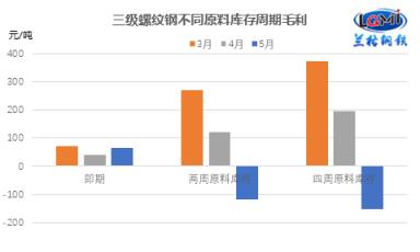 5月份由于成本表現(xiàn)分化,市場均值震蕩下行,使得5月份品種噸鋼毛利相比上月有明顯差異。以三級螺紋鋼為例,以即期原料成本測算5月份毛利空間較上月上升25元/噸,以兩周、四周原料庫存周期測算5月份毛利空間均進入虧損負(fù)值區(qū)間,兩周原料庫存周期測算毛利較上月減少239元/噸,以四周原料庫存周期測算5月份毛利空間較上月減少347元/噸(詳見圖2)。