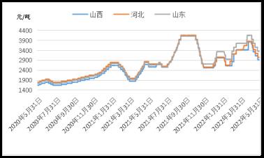 據(jù)云商平臺監(jiān)測數(shù)據(jù)顯示,截至5月31日,山西臨汾地區(qū)二級冶金焦含稅出廠價在2930元,較月初跌900元;唐山地區(qū)二級冶金焦含稅出廠價在3050元,較月初跌800元;山東淄博地區(qū)二級冶金焦含稅出廠價在3360元,較月初跌800元(詳見圖3)。