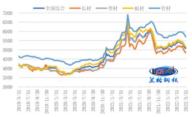 5月份,穩(wěn)增長信號和政策雖明顯加強(qiáng),但受疫情影響下游需求釋放緩慢,市場預(yù)期和信心明顯不足,國內(nèi)無縫鋼管市場價格持續(xù)震蕩下行。據(jù)云商平臺監(jiān)測數(shù)據(jù)顯示,截至5月31日,全國無縫鋼管 厚壁鋼管綜合價格為5098元,較上月末下跌258元,跌幅為4.8%,年同比下跌10.6%。其中,長材價格為4875元,較上月末下跌288元,跌幅5.6%,年同比下跌8.9%;板材價格為5190元,較上月末下跌235元,跌幅為4.3%,年同比下跌12.8%;型材價格指數(shù)為5166元,較上月末下跌241元,跌幅為4.5%,年同比下跌9.6%;管材價格為5716元,較上月末下跌241元,跌幅為4.1%,年同比下跌8.2%(詳見圖1)。