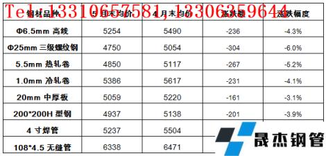 分品種來看,云商平臺監(jiān)測的8大無縫鋼管 厚壁鋼管品種10大城市均價顯示,5月31日,各品種價格相比上月底均明顯下跌,其中,三級螺紋鋼跌幅最大,為6.0%;無縫管跌幅最小,為2.1%;其他品種跌幅在3.1-5.2%之間(詳見表1)。