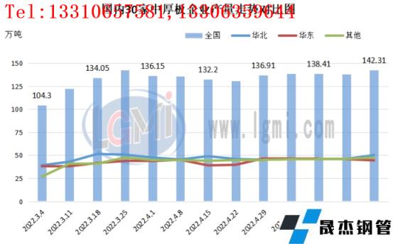 截止2022年5月27日,據(jù)云商平臺(tái)監(jiān)測(cè)數(shù)據(jù)顯示,國(guó)內(nèi)中厚板社會(huì)庫(kù)存量約為115.5萬(wàn)噸,環(huán)比增加1.6萬(wàn)噸左右,月同比增加10.4萬(wàn)噸左右,年同比增加約2.9萬(wàn)噸左右。5月份30家樣本鋼企庫(kù)存量呈現(xiàn)持續(xù)增長(zhǎng)走勢(shì),截止5月27日,追蹤國(guó)內(nèi)30家中板鋼企庫(kù)存量約為46.6萬(wàn)噸,與4月份相比基本持平,其中華北區(qū)域14家樣本企業(yè)廠內(nèi)庫(kù)存約為22.7萬(wàn)噸,同比4月份同期增加約5.5萬(wàn)噸左右,華東區(qū)域12家樣本企業(yè)廠內(nèi)庫(kù)存約為15.2萬(wàn)噸,同比4月份同期下降約2萬(wàn)噸左右,除華北、華東區(qū)域外,11家樣本企業(yè)廠內(nèi)庫(kù)存約為8.7萬(wàn)噸,同比4月份同期基本持平。