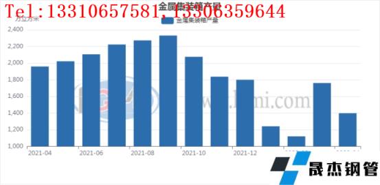 國(guó)內(nèi)下游產(chǎn)品供應(yīng)分品種來看,4月份國(guó)內(nèi)金屬集裝箱產(chǎn)量為1398.4萬(wàn)立方米,環(huán)比3月份增產(chǎn)約363.3萬(wàn)立方米。同比21年同期下降約561.9萬(wàn)立方米。