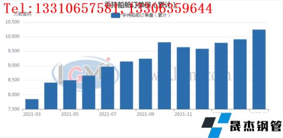 4月份國(guó)內(nèi)手持船舶訂單量累計(jì)為10247萬(wàn)載重噸,環(huán)比3月份增長(zhǎng)約337萬(wàn)載重噸。同比21年同期增加約1828萬(wàn)載重噸。