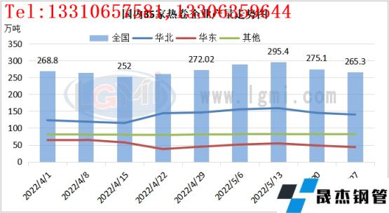 截止2022年5月27日,據(jù)云商平臺(tái)監(jiān)測(cè)數(shù)據(jù)顯示,國內(nèi)熱軋卷板社會(huì)庫存量約為243.71萬噸,環(huán)比增加10.72萬噸。重點(diǎn)城市庫存整體表現(xiàn)不一,華東、華南庫存小幅去庫,華北區(qū)域天津社會(huì)庫存有所累庫。具體來看,廣州地區(qū)熱卷社會(huì)庫存量約為61.91萬噸,環(huán)比減少3.05萬噸;上海熱卷社會(huì)庫存量環(huán)比減少0.21萬噸至41.84萬噸;天津熱卷社會(huì)庫存量約為7.20萬噸,環(huán)比增加1.58萬噸。