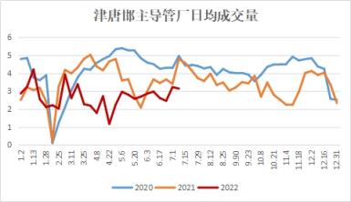 從焊鍍管品種來看,截至6月30日,上半年在統(tǒng)計11家管廠日均出貨量2.69萬噸,同比去年同期下降26.90%,同比2020年同期下降30.49%,其中6月環(huán)比上月增長1.32%,上半年高預期、高供應(yīng)持續(xù)發(fā)酵,但需求受疫情等影響,持續(xù)后延,管廠日均出貨峰值4.2萬,為農(nóng)歷春節(jié)前的冬儲階段。上半年在統(tǒng)計國內(nèi)各區(qū)域貿(mào)易商日均出貨量峰值在3月初,均值下滑24.63%,其中6月處于上半年平均日出貨量中線上方水平,較均值增長9.19%,較年內(nèi)峰值下滑17%。7月價格跌勢超出預期,終端實際需求釋放仍將有限,預計7、8月份仍是一個高庫低需的景象;同時,厚壁鋼管產(chǎn)業(yè)鏈虧損程度亦超預期,關(guān)注庫存的下降斜率變化。