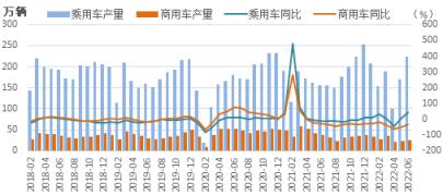 圖2 2017-2022年乘用車和商用車月度產(chǎn)量及同比增速