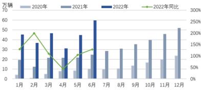 6月份,新能源汽車產(chǎn)銷分別完成59萬輛和59.6萬輛,同比均增長1.3倍,產(chǎn)銷量同比增速明顯回升。1-6月份,新能源汽車產(chǎn)銷分別完成266.1萬輛和260萬輛,同比均增長1.2倍,市場占有率21.6%。中汽協(xié)預計,2022年新能源汽車銷量有望達到550萬輛,同比增長56%以上。