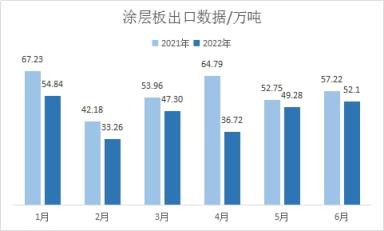 2022年6月我國涂層板(帶)出口總量共計(jì)52.10萬噸,月環(huán)比上升5.73%,年同比下降8.94%。2022年1-6月我國涂層板(帶)出口總量共計(jì)273.49萬噸,年同比下降19.12%。